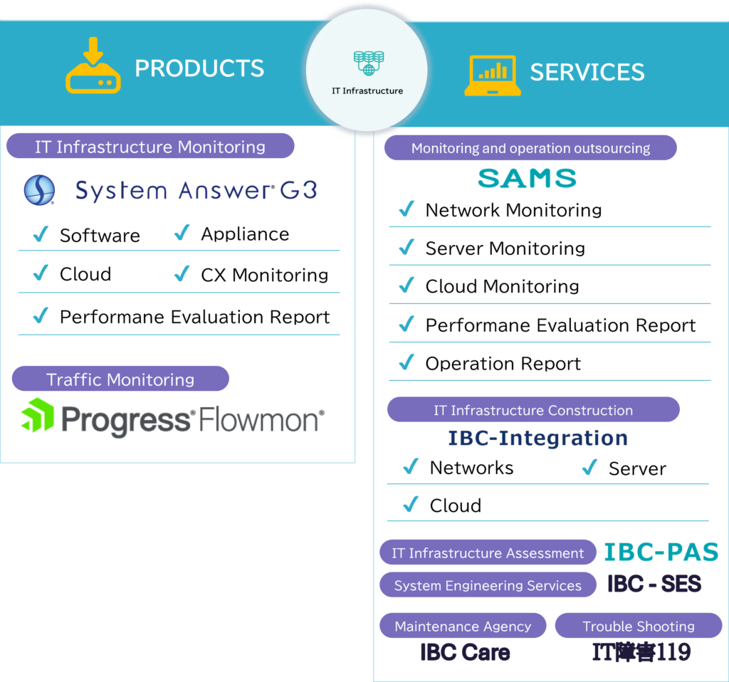 We will support you that anyone can easily introduce everything from development / sales / support of the network system performance monitoring tool System Answer series to network system consulting, performance evaluation, design / construction, and development / provision of IoT security infrastructure services.
