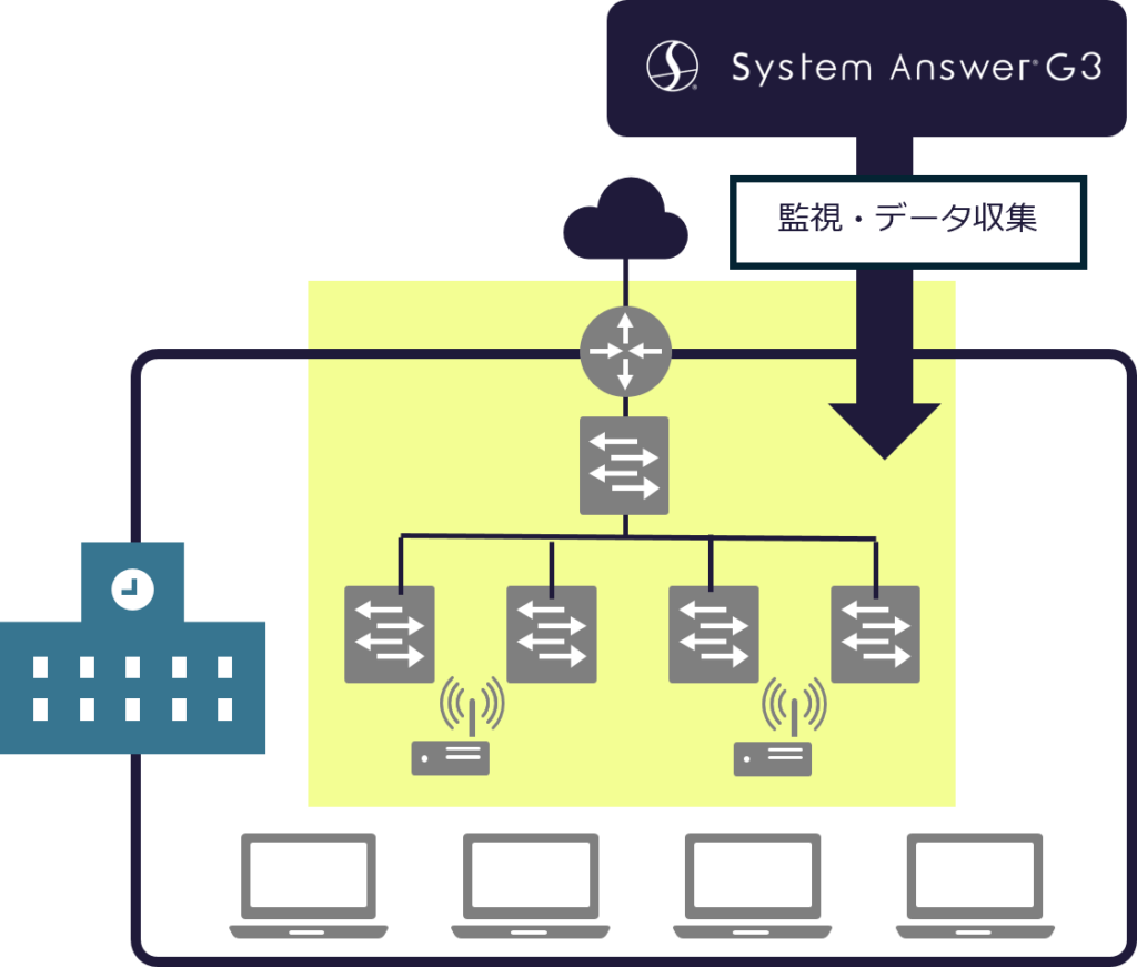 調査対象の学校、又はデータセンター等、調査対象のNWと通信可能な場所に調査機( System Answer G3 )を設置。各機器へのSNMP通信により通信状況を取得します。