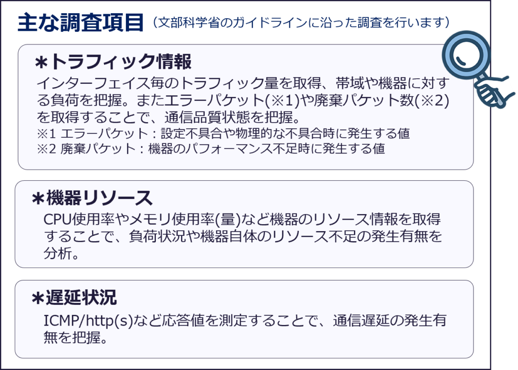 - 文部科学省の指針に基づいた調査により、最適なネットワーク環境に向けたアドバイスを行います。