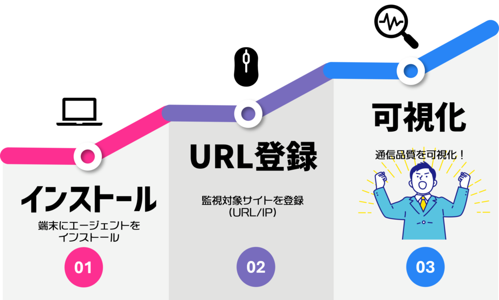 3台からそれぞれのネットワークパスを計測、合計で3モニタリング(計測)です。