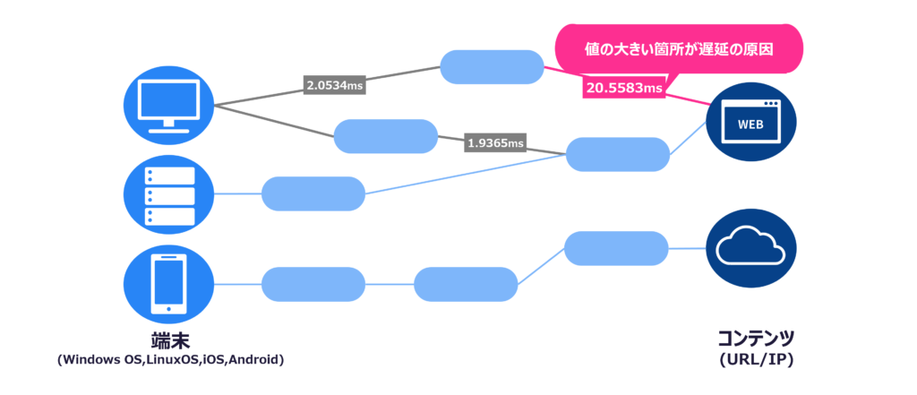 デジタル教材の利用増加に伴い、学習サービス利用時のアクセス遅延等、端末からサービスまでの通信経路のうち、どこで遅延が発生しているのかを確認することができます。