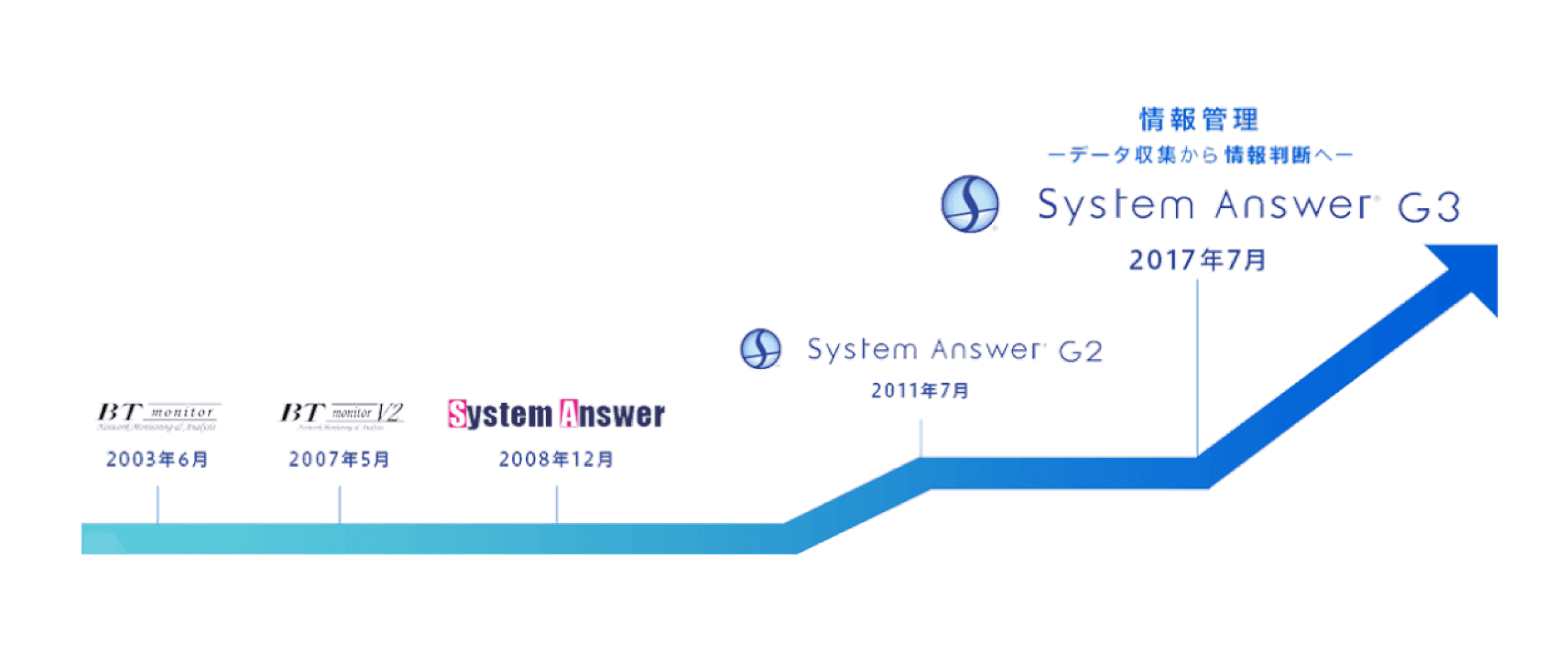 2008年に販売開始した主力製品「System Answer シリーズ」は、2017年には3世代目となる「System Answer G3」がリリースされ、導入実績 1,000社以上、ITシステム機器の監視数 1,800万項目以上のライセンス販売実績を重ねています。「System Answer シリーズ」は、120社以上のネットワーク関連機器に対応するマルチベンダー対応が最大の特徴です。