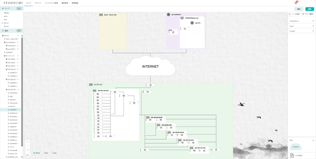 「ITOGUCHI」は、マルチクラウド・マルチベンダー環境に対応したインフラ構成管理ツールで、複雑化するITインフラの構成情報を自動で検知・描画し、常に最新の状態を維持することで、構成管理の効率化と障害対応の迅速化を実現します。
